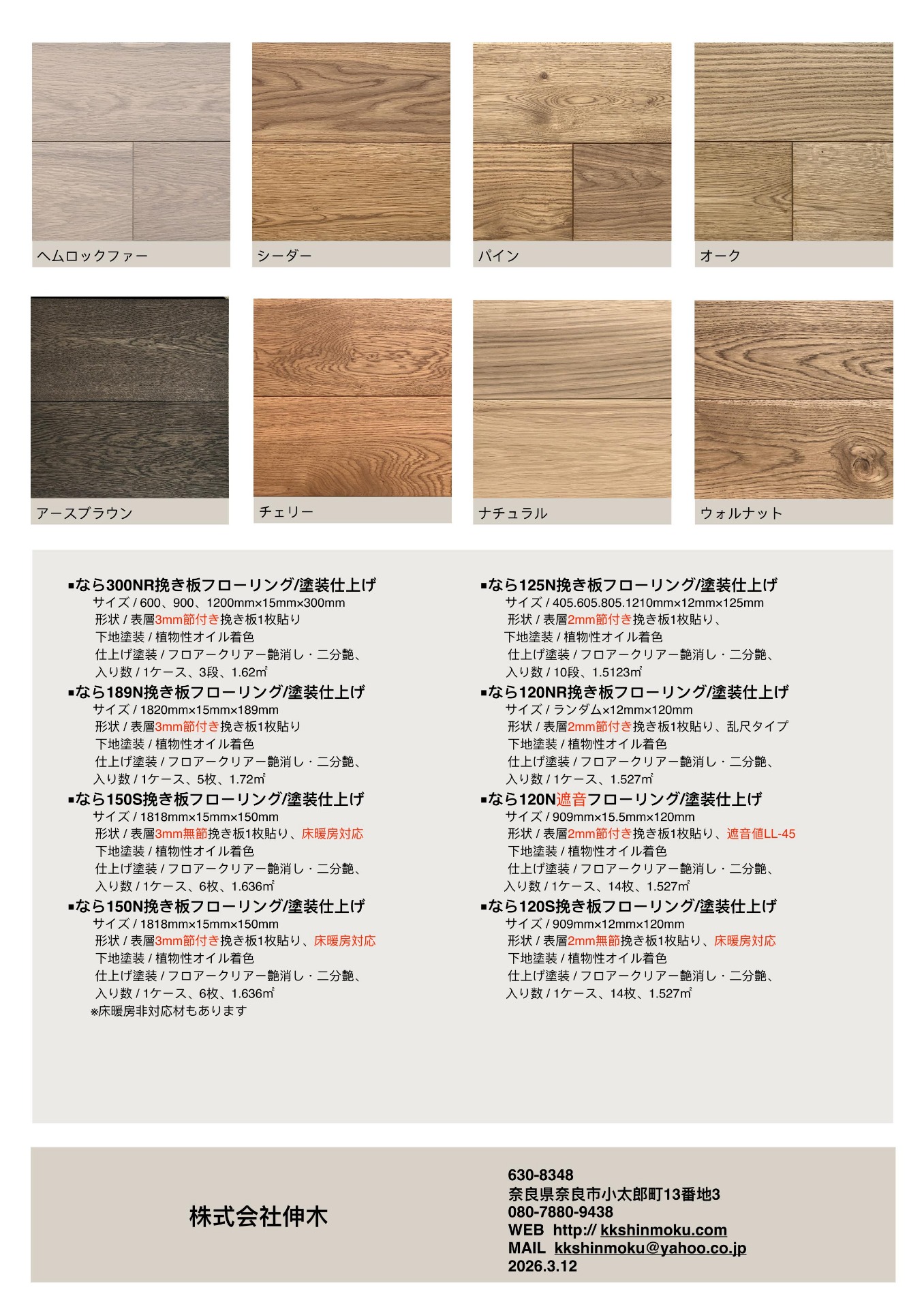 「なら挽き板複合フローリング」以外にも、他樹種、他サイズ、他カラーの無垢・複合フローリングのどちらでも取り扱っています。ご質問等ございましたら、ご遠慮なくお問い合わせください。